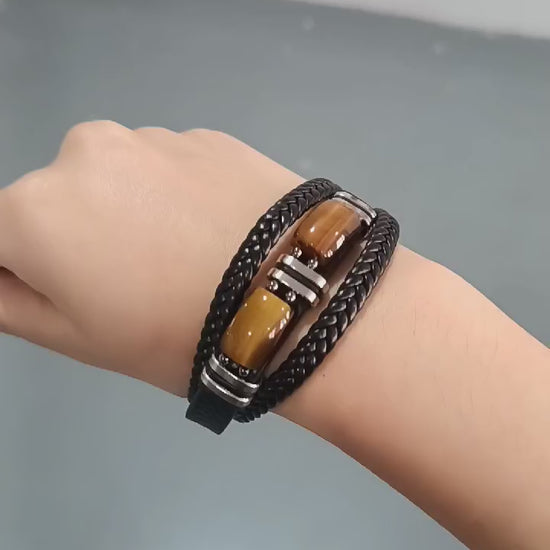 A premium men’s bracelet featuring a stylish triple-layer leather design combined with original natural Tiger Eye stones. Crafted with European-grade materials and stainless steel fittings, this bracelet offers durability, elegance, and everyday comfort.